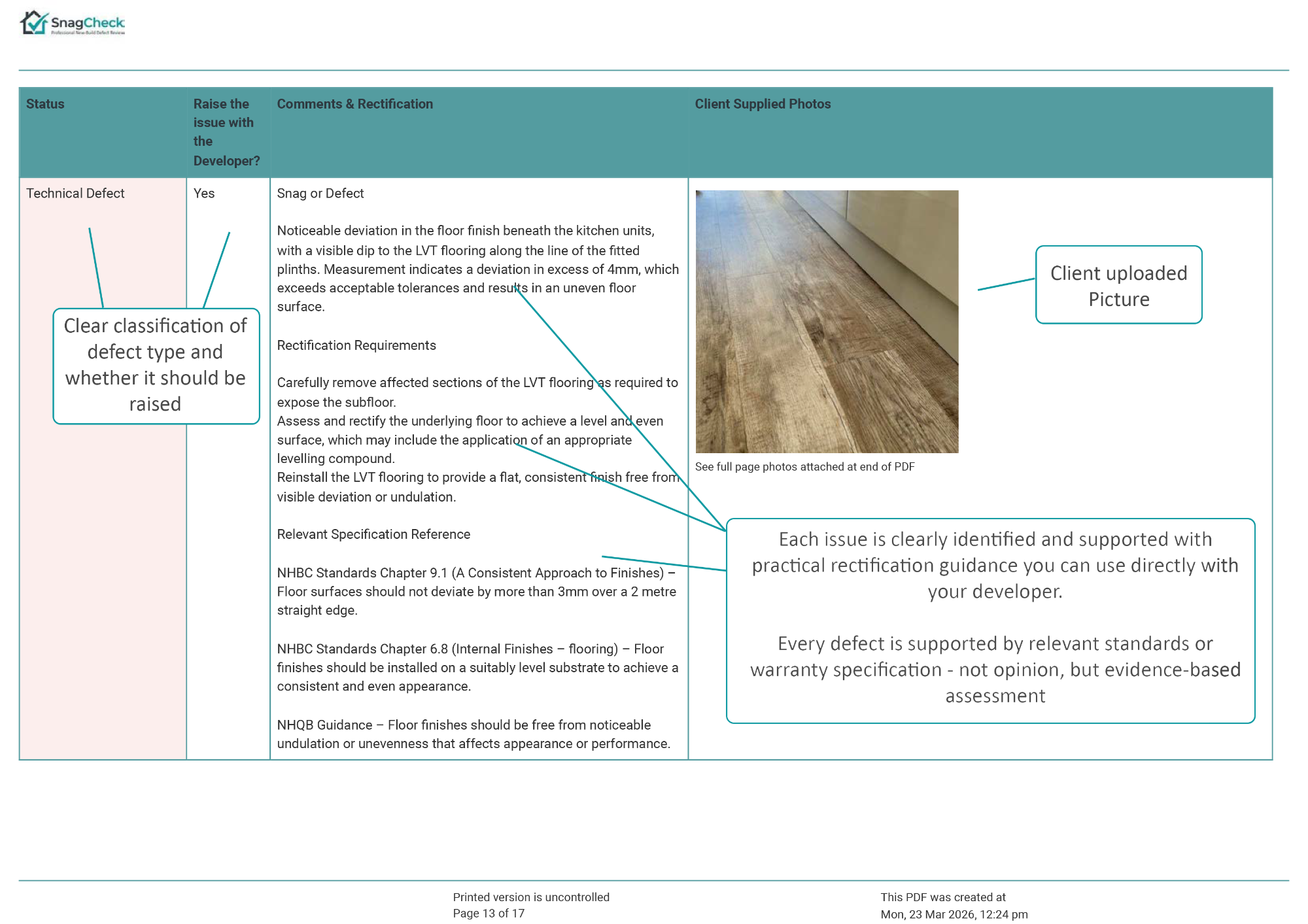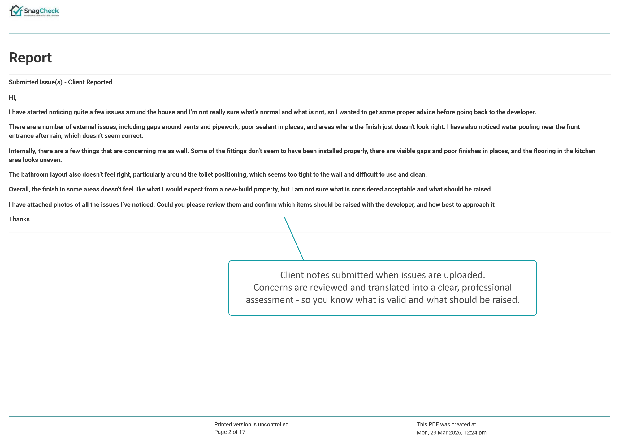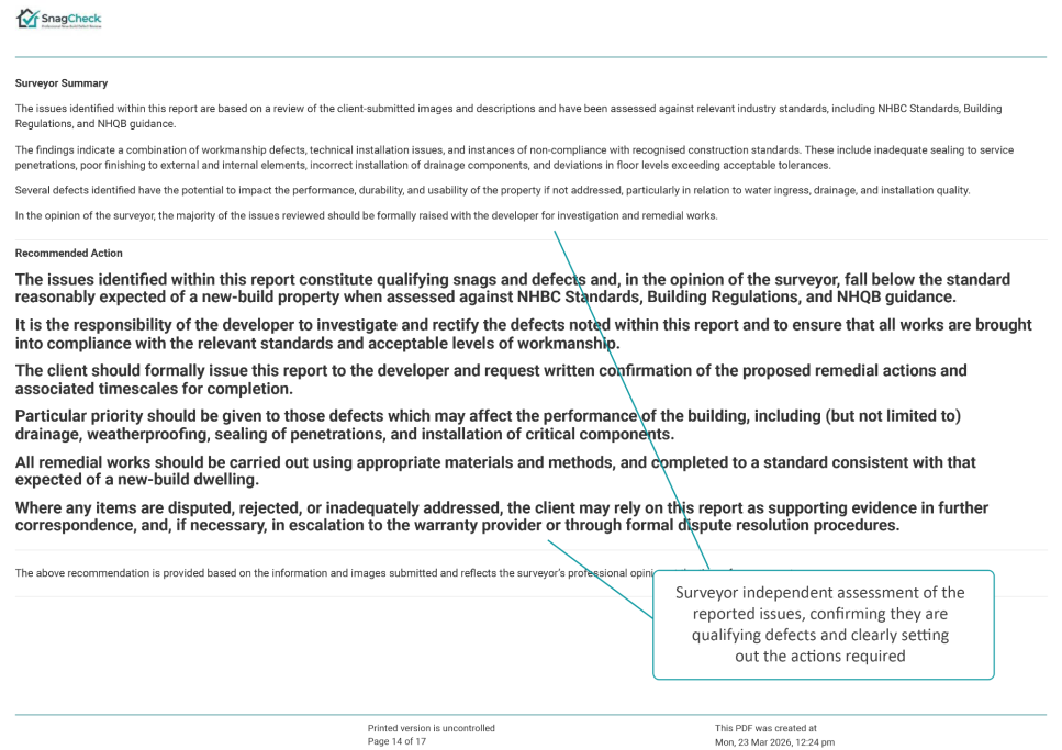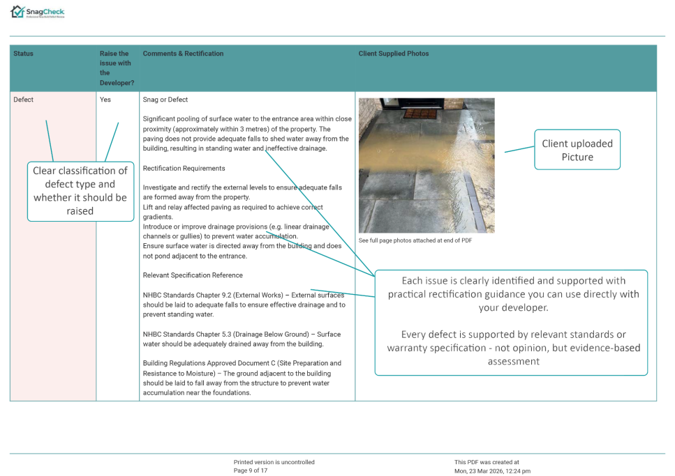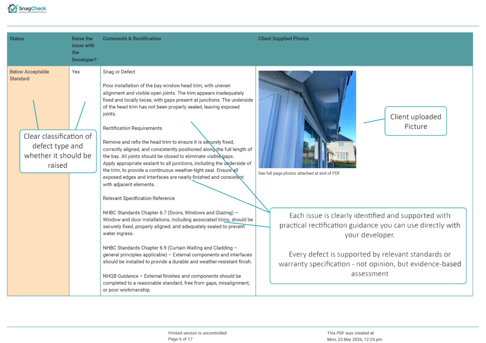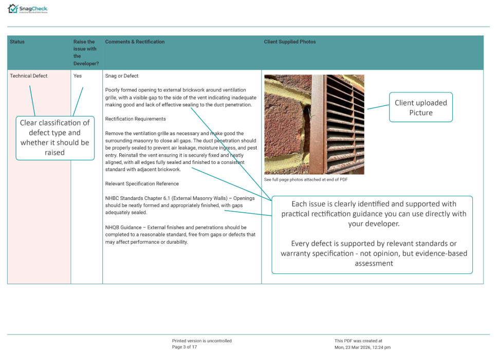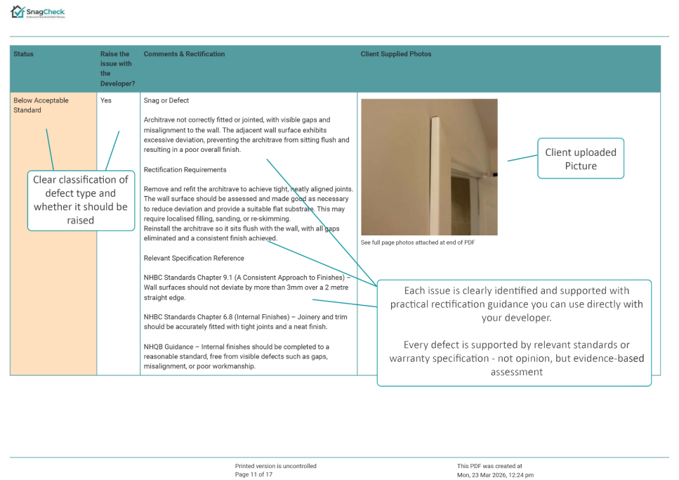 The report explains whether the issue is likely to represent a snag or defect, provides professional commentary on the concern, and confirms whether the matter should be raised with the developer.