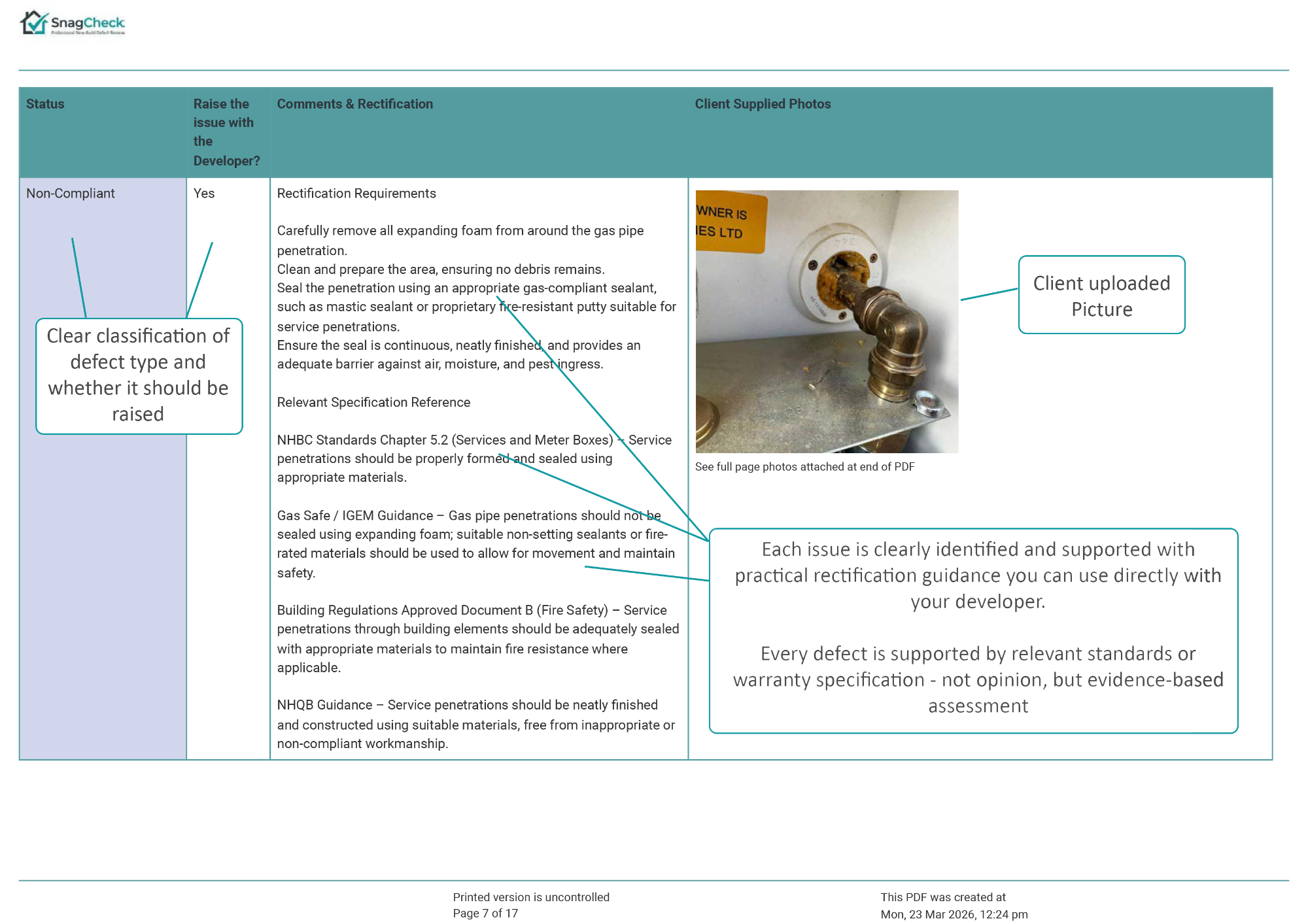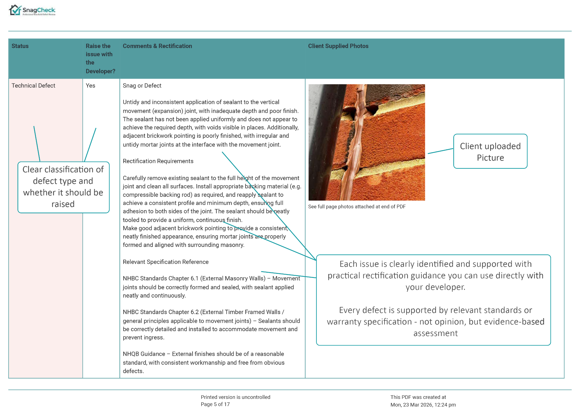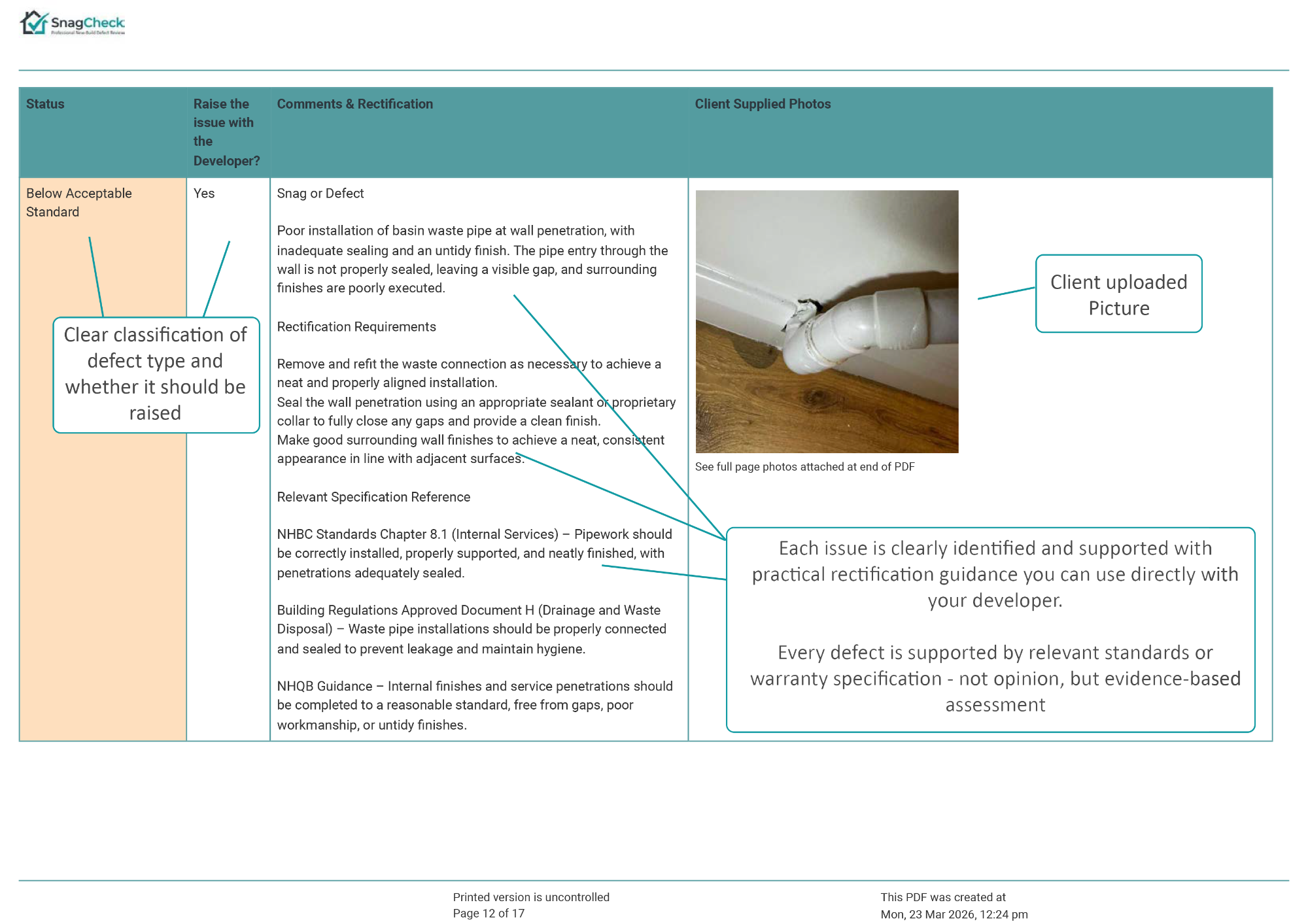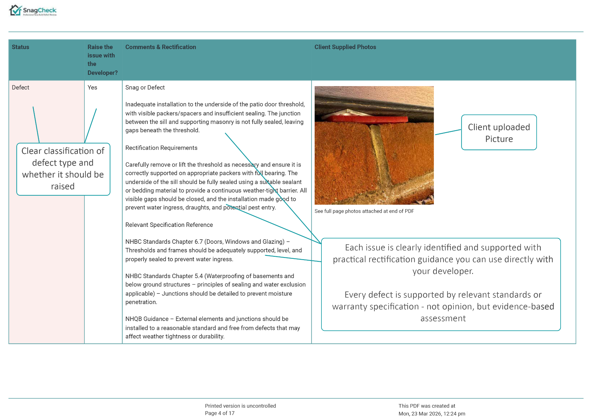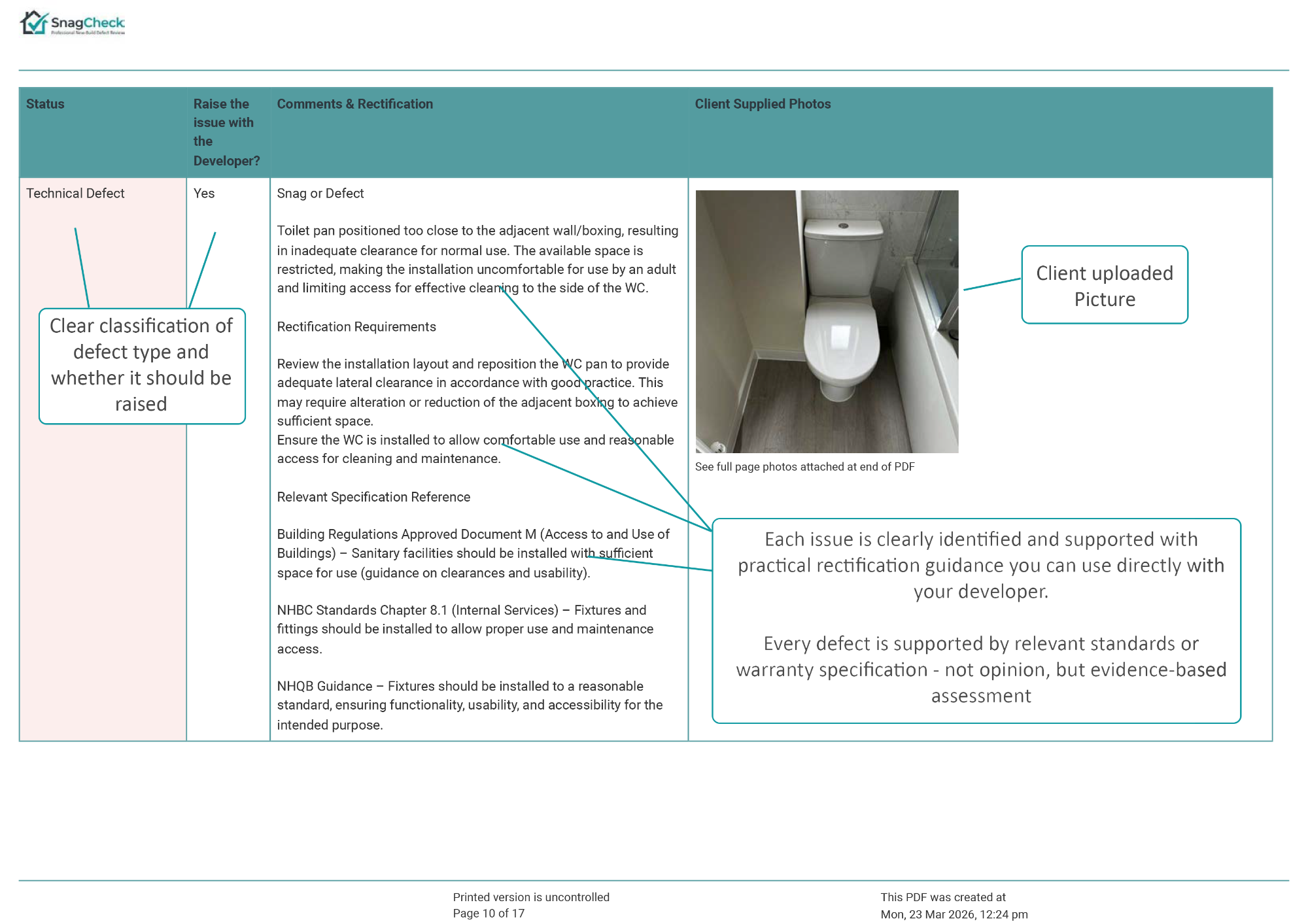 The report explains whether the issue is likely to represent a snag or defect, provides professional commentary on the concern, and confirms whether the matter should be raised with the developer.