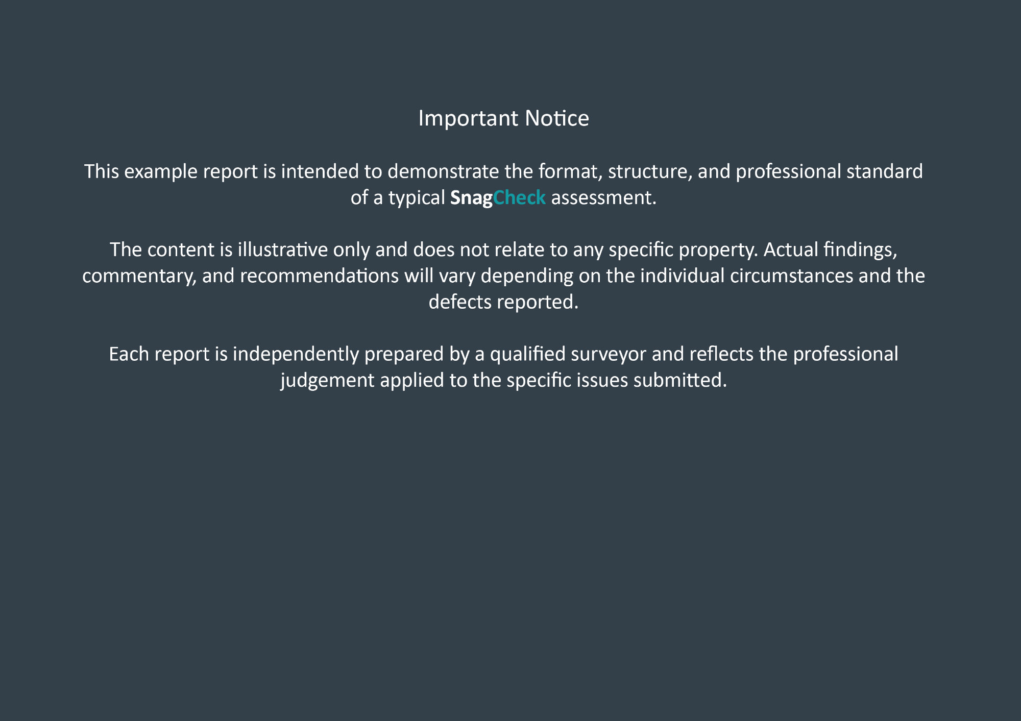 This example report is intended to demonstrate the format, structure, and professional standard of a typical SnagCheck assessment.