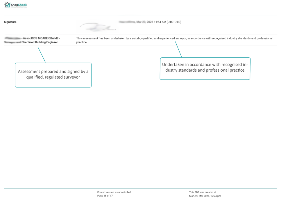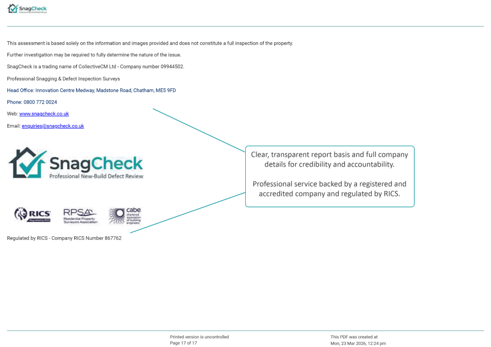 Every SnagCheck submission is reviewed by an experienced surveyor and delivered as a structured PDF assessment report.