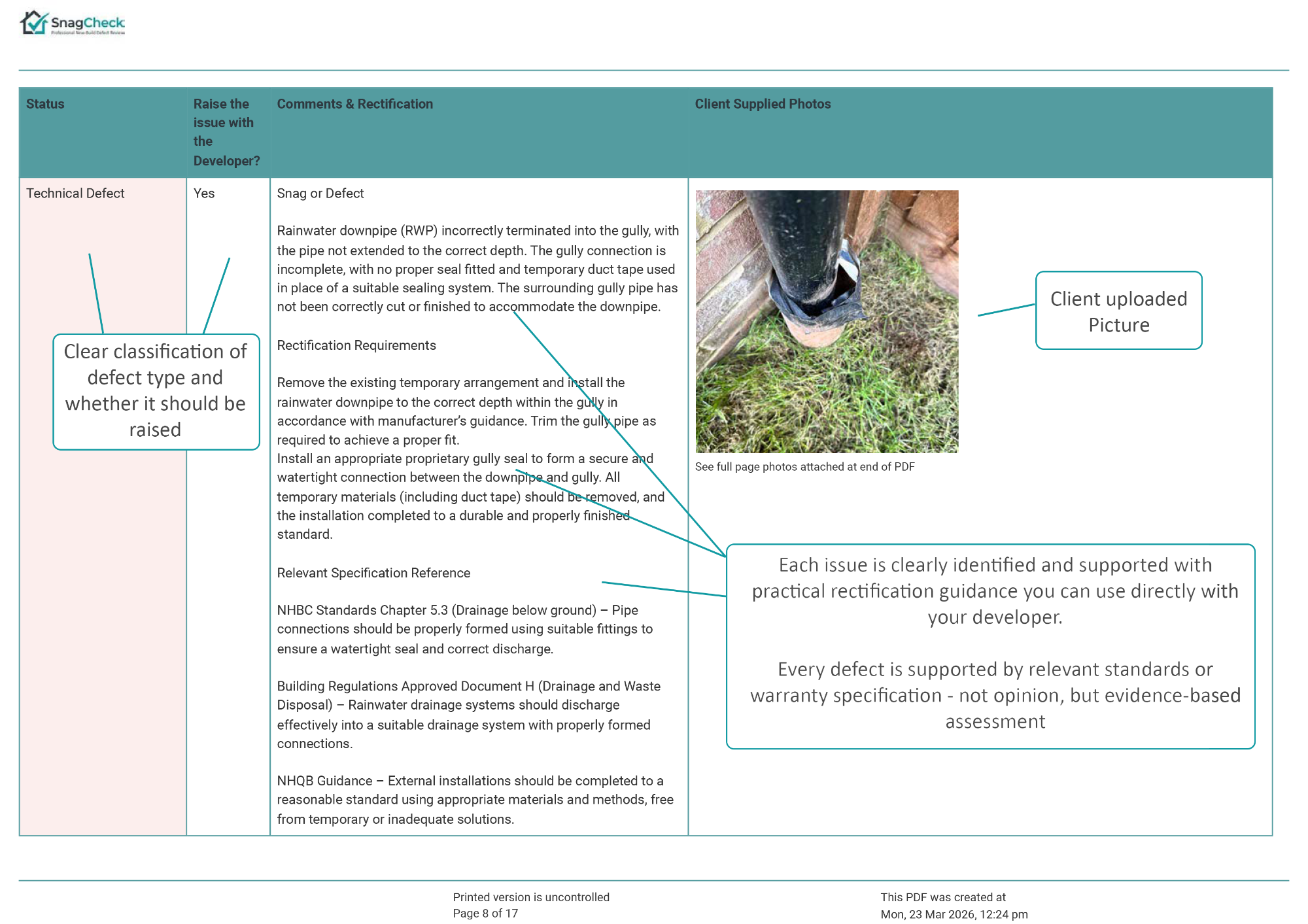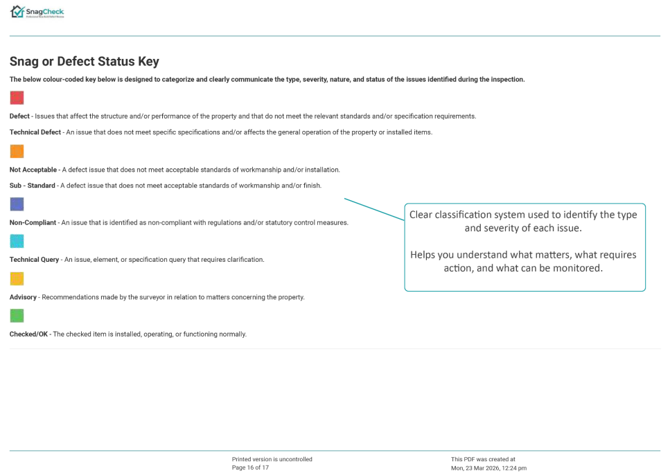 The example below shows the format of a typical SnagCheck assessment report.